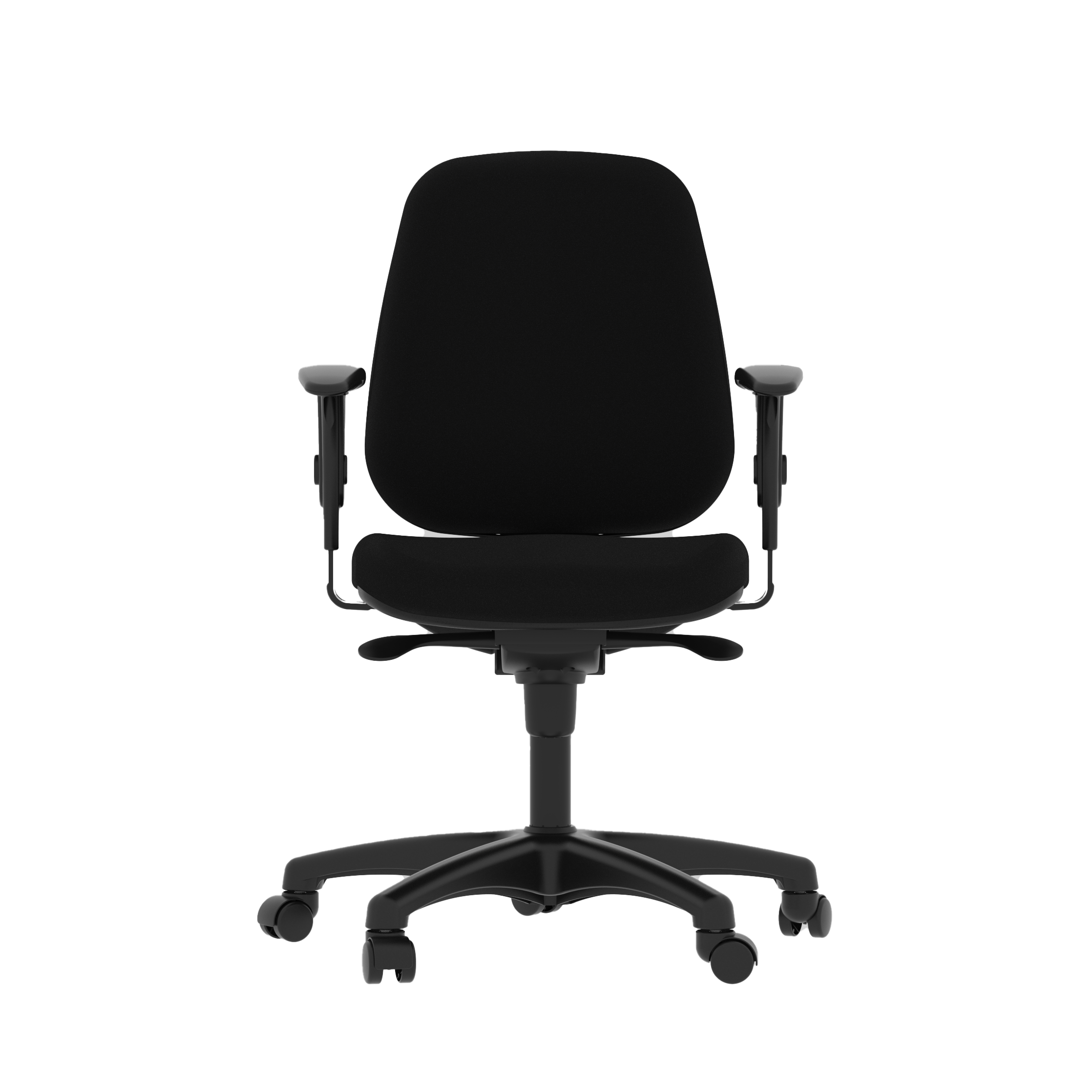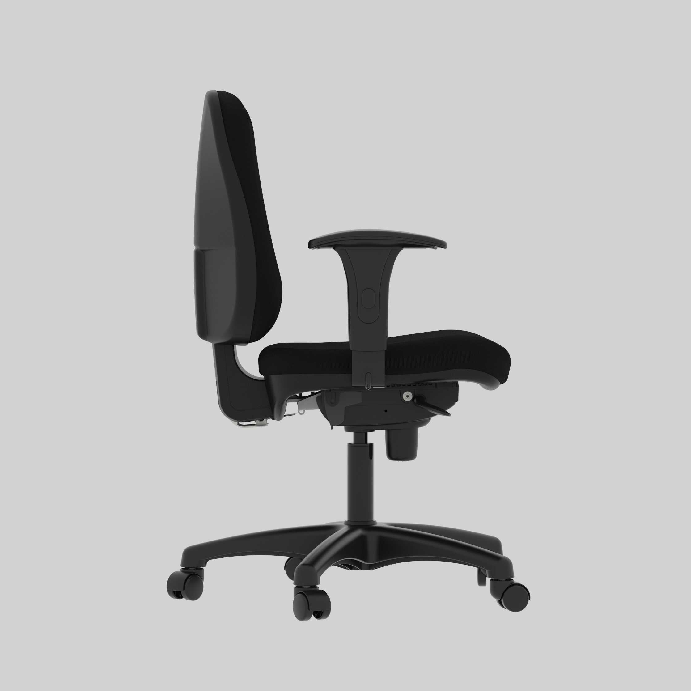 Os apoios de braço são reguláveis em altura, conforme normas da ABNT, e os rodízios de 50 mm são indicados para todos os tipos de piso. O mecanismo ajustável, certificado pela NBR 13962:2018, permite inclinação do encosto e ajuste de altura do assento.