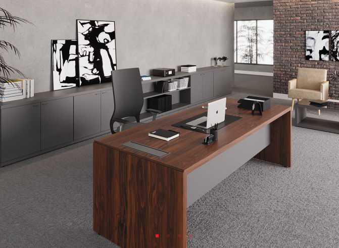 As mesas executivas foram projetadas para ambientes de diretoria e liderança. Com tampos e painéis laterais em MDP de 40 mm, acabamento chanfrado em 45° e detalhes em alumínio, unem robustez e sofisticação. Disponíveis com ou sem credenza acoplada (direita ou esquerda), oferecem funcionalidade, espaço e um visual imponente, ideal para composições modernas e elegantes.